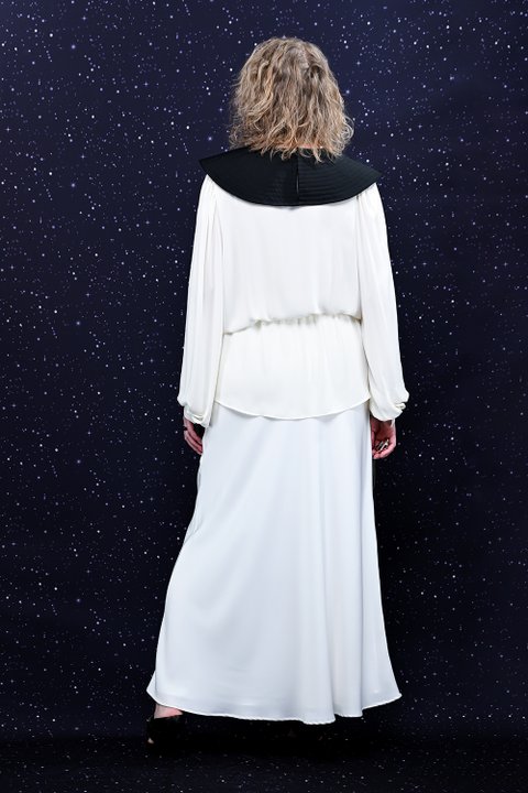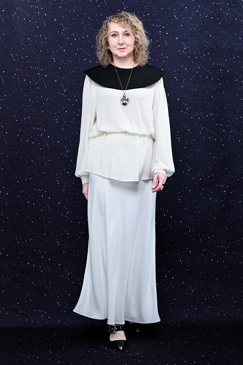 Летящая блуза со съёмным воротником выполнена из невесомой полупрозрачной ткани, сочетаем её с атласной юбкой в тон. Элегантный и практичный выбор - блуза не мнется, но при этом сохраняет форму и красиво драпируется. Воротник съемный.