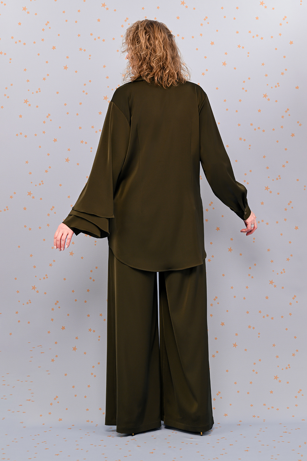 За блузой очень просто ухаживать, ведь плотный премиальный сатин практически не мнётся, легко стирается и быстро сохнет. Комбинируйте её с повседневным денимом и костюмными брюками, а атласная юбка или брюки помогут создать нарядный образ.