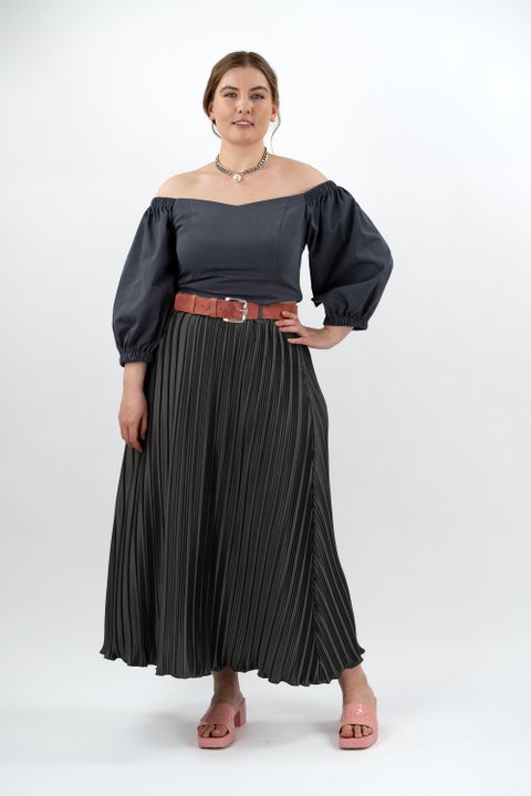 Плиссированная юбка длины миди, силуэт трапеция. Модель прилегающего силуэта, расклешенная к низу, пояс притачной, на резинке со шлевками.