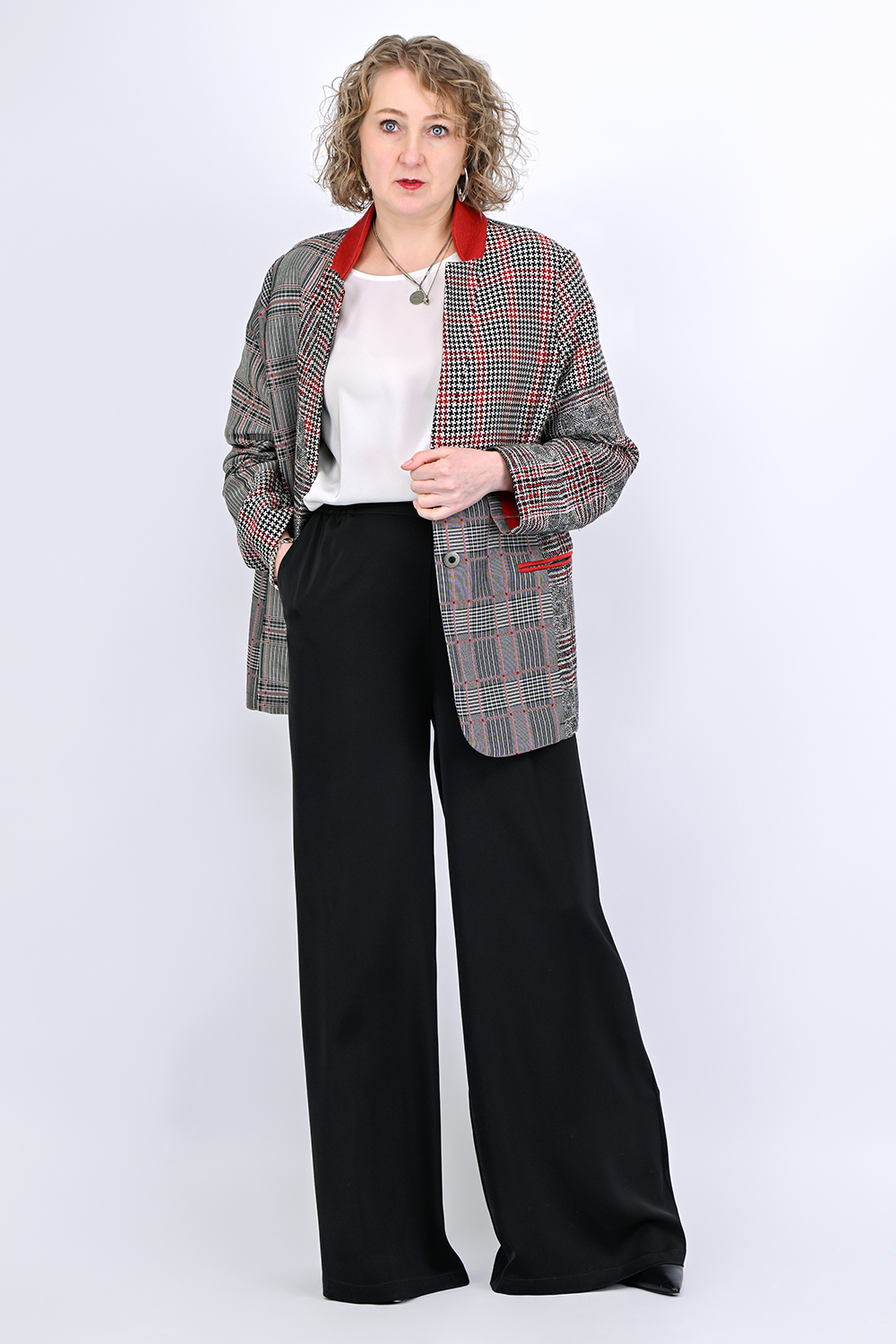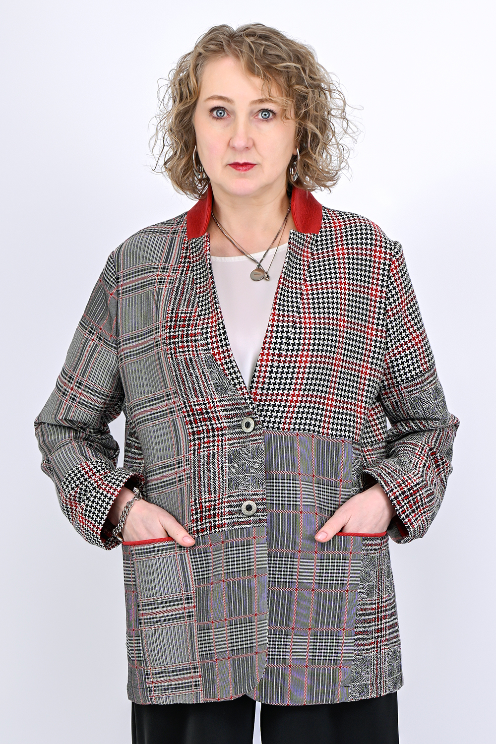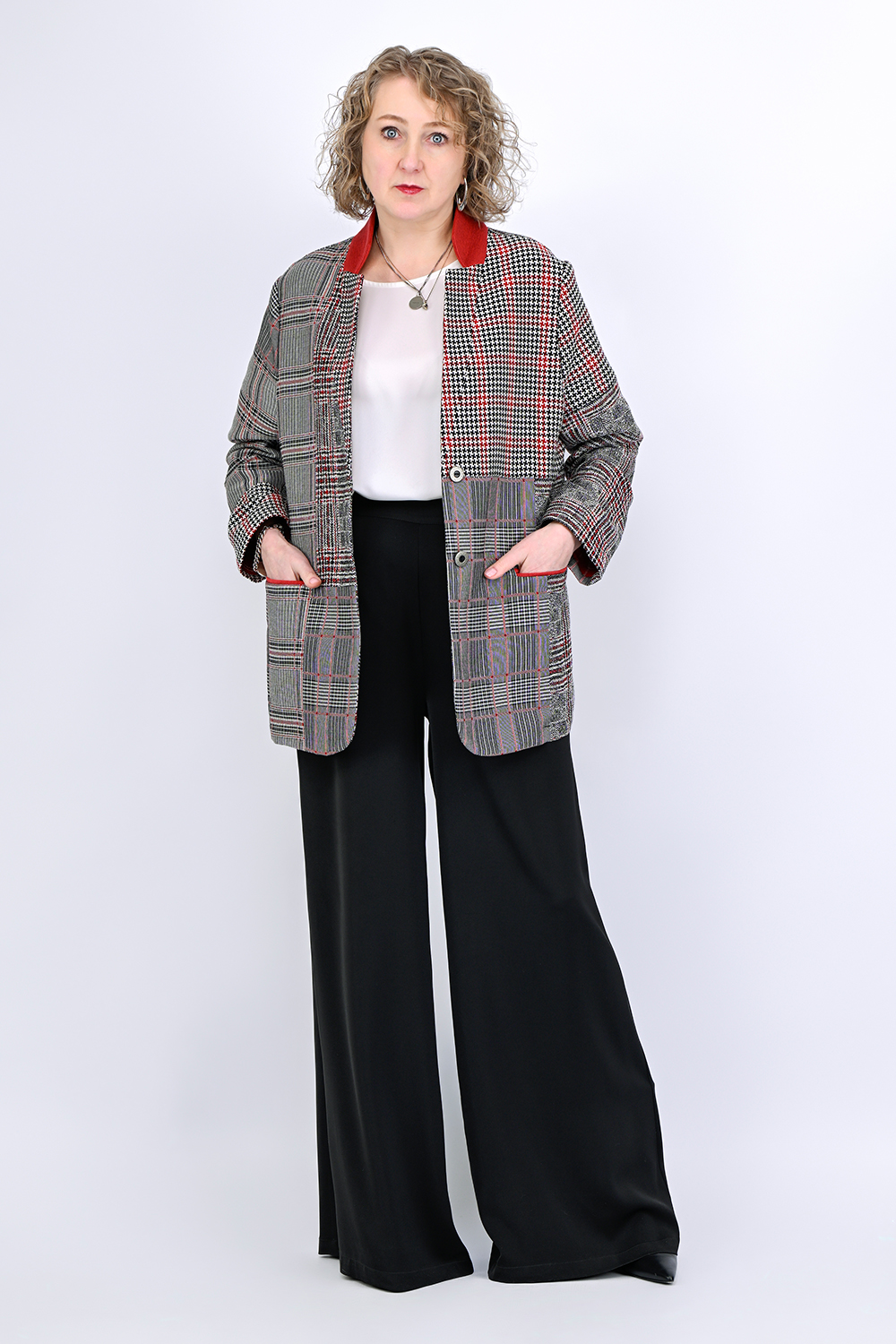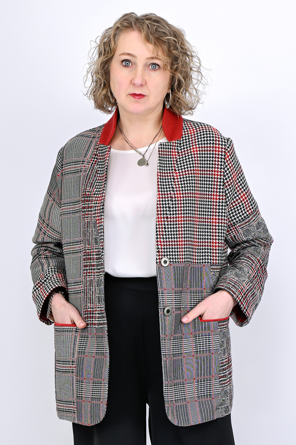 Структурный, тактильно приятный жакет из хлопка с вискозой словно приглашает провести по нему рукой. Он плотный, но, приятный к телу, хорошо держит форму — структурирует силуэт, фигура становится более подтянутой. Рисунок пэчворк добавляет уникальности: будто ткань собрана вручную из винтажных лоскутов, но на самом деле это редкое в наше время жаккардовое плетение. Сложная благородная палитра угольно-серых тонов и отделка красно-кирпичного цвета работает как магнит для взгляда. Чтобы не добавлять лишнего объема и сохранить комфорт натуральной ткани мы создали этот жакет без подкладки и обработали швы шелком, он красив внутри так же как и снаружи. Жакет сочетается с базовыми вещами гардероба: чёрными и молочными брюками, джинсами, лаконичными платьями. Этот жакет входит в эстетику городской интеллектуалки: смелой, нестандартной, но сдержанной. Застёгнутый, он создаёт архитектурный верх, который стройнит и визуально собирает фигуру. В расстёгнутом виде — формирует вытягивающую вертикальную рамку. Пройма широкая, комфортная для рук разного объёма. Выбираем такой жакет, если хочется носить что-то необычное, современное, но не вычурное. Люксовый материал из Италии приятен на ощупь и не мнется. Вещь из серии, когда не знаем что надеть, надеваем ее - везде уместно, ко всему подходит. Самая ТОП-овая позиция Peppiris, но ткань в ограниченном количестве, и повторить этот жакет мы, скорее всего, уже не сможем.
