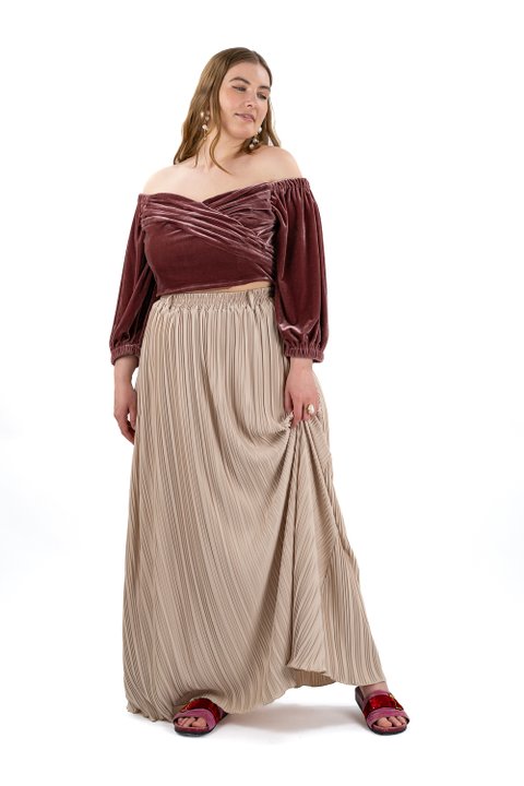 Плиссированная юбка длины макси, силуэт трапеция. Модель прилегающего силуэта, расклешенная к низу, пояс притачной, на резинке со шлевками.